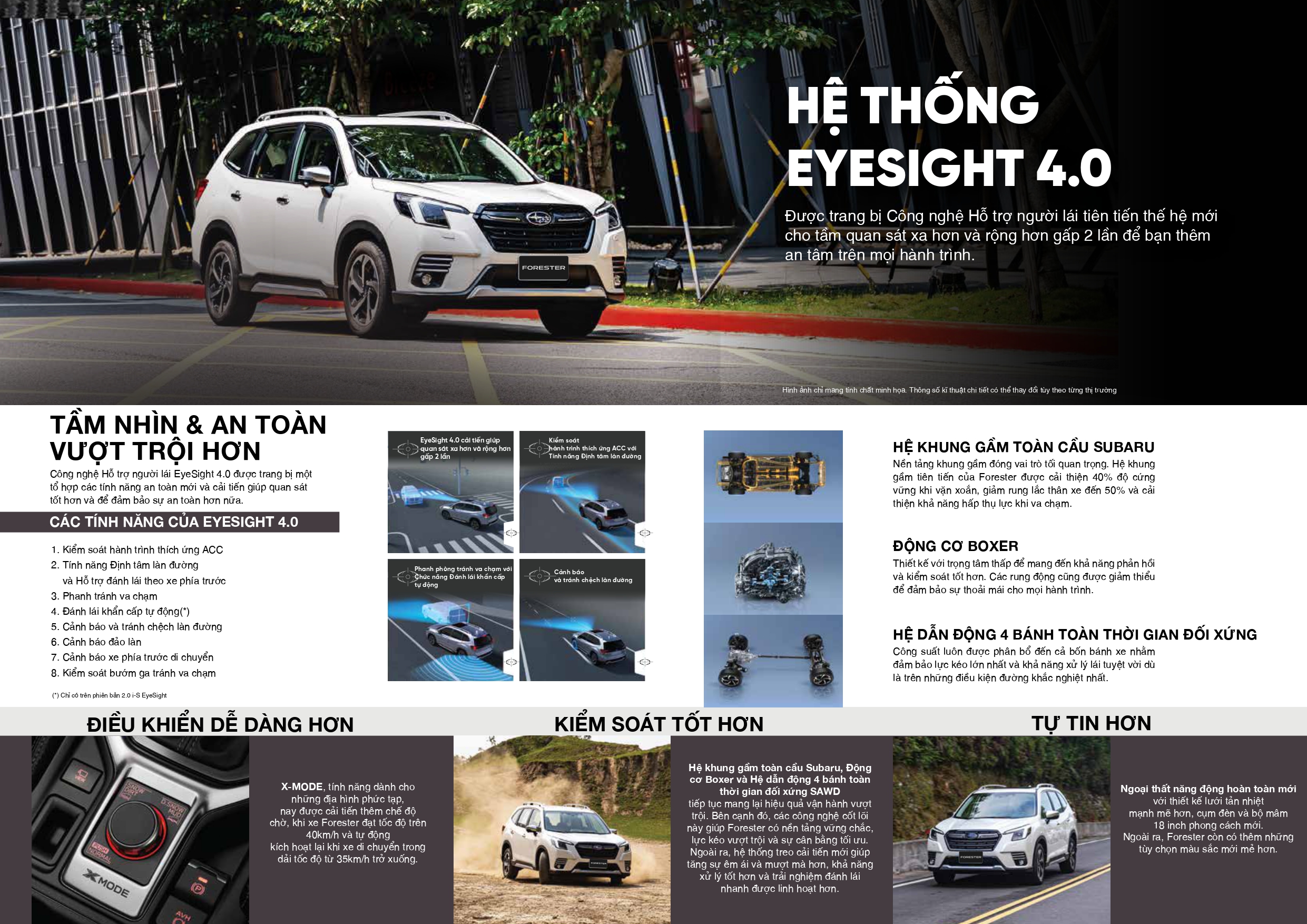 Mà còn là sự kết hợp giữa công nghệ an toàn tiên tiến và tư duy thiết kế thông minh Nhật Bản, mang lại sự an tâm cho cả gia đình trên mọi chuyến đi. Đặc biệt, Forester được trang bị hệ thống X-MODE với 2 chế độ vượt địa hình, giúp xe tự tin chinh phục bùn lầy, tuyết trơn hay đường dốc gồ ghề, mở rộng khả năng di chuyển linh hoạt trên mọi cung đường